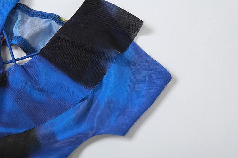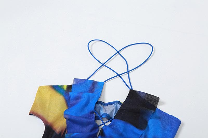 Be the first to review “Cross front backless sheer mesh see through slit contrast print maxi dress”